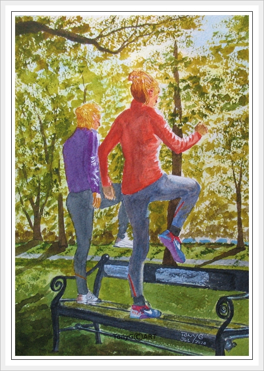 This watercolour captures life during lock-down here in the UK in the midst of the Covid-19 pandemic when more people decided to take daily exercise. These two ladies are making use of the bench to get loosened up and ready for a morning jog.